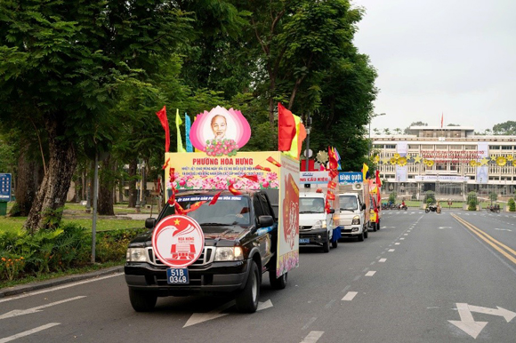 Đoàn xe hoa tuyên truyền của các phường, xã với nhiều khẩu hiệu, hình ảnh cổ động diễu hành trên các tuyến đường trung tâm TP.HCM.
